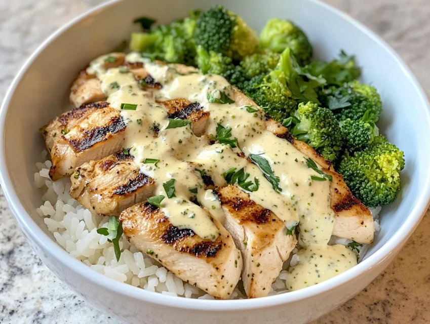 Bols de poulet grillé au brocoli avec sauce à l’ail crémeuse