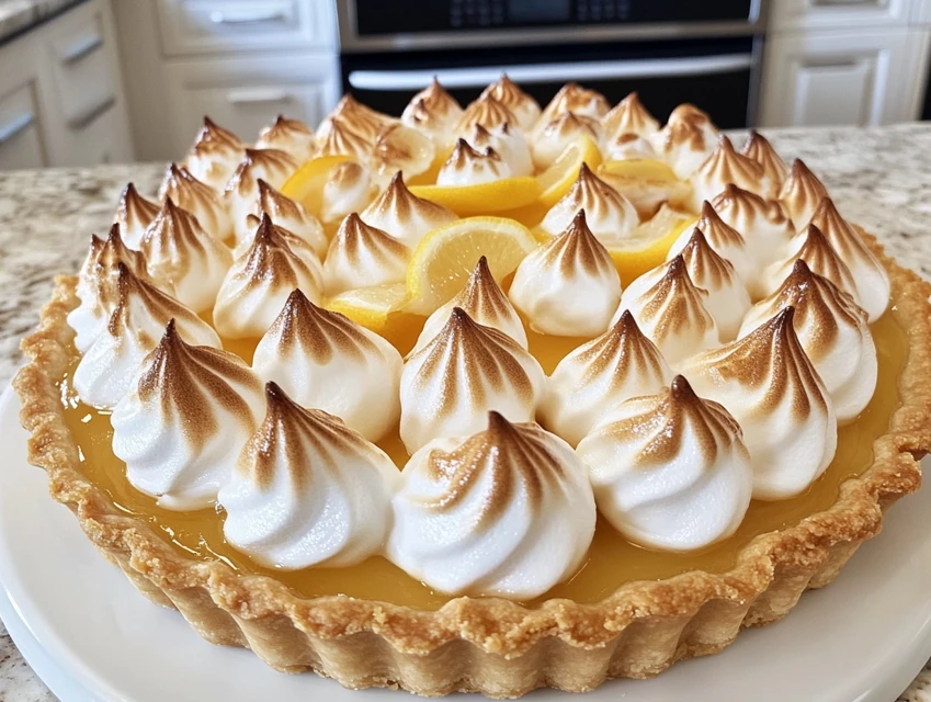 - Versez la garniture au citron sur la pâte refroidie. Étalez la meringue sur la garniture, en créant des pics avec le dos d'une cuillère. Enfournez à 180°C pendant environ 10 minutes jusqu'à ce que la meringue soit dorée. Laissez refroidir avant de servir.