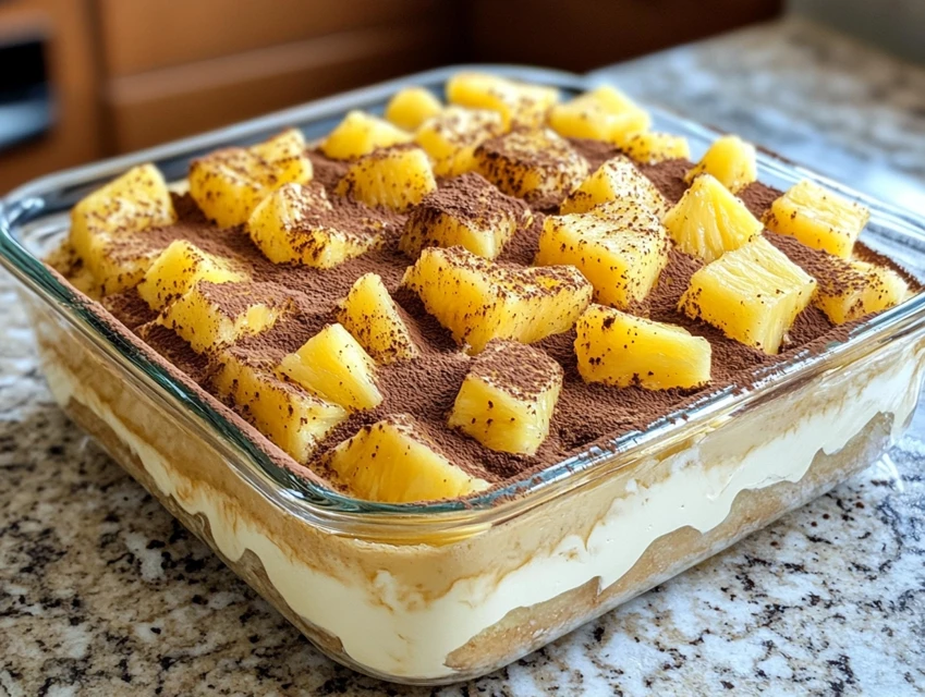 Enfin, pour une présentation impeccable, n’hésitez pas à décorer votre tiramisu juste avant de servir. Une touche de noix de coco râpée et quelques morceaux d’ananas frais apporteront une note finale élégante et appétissante.